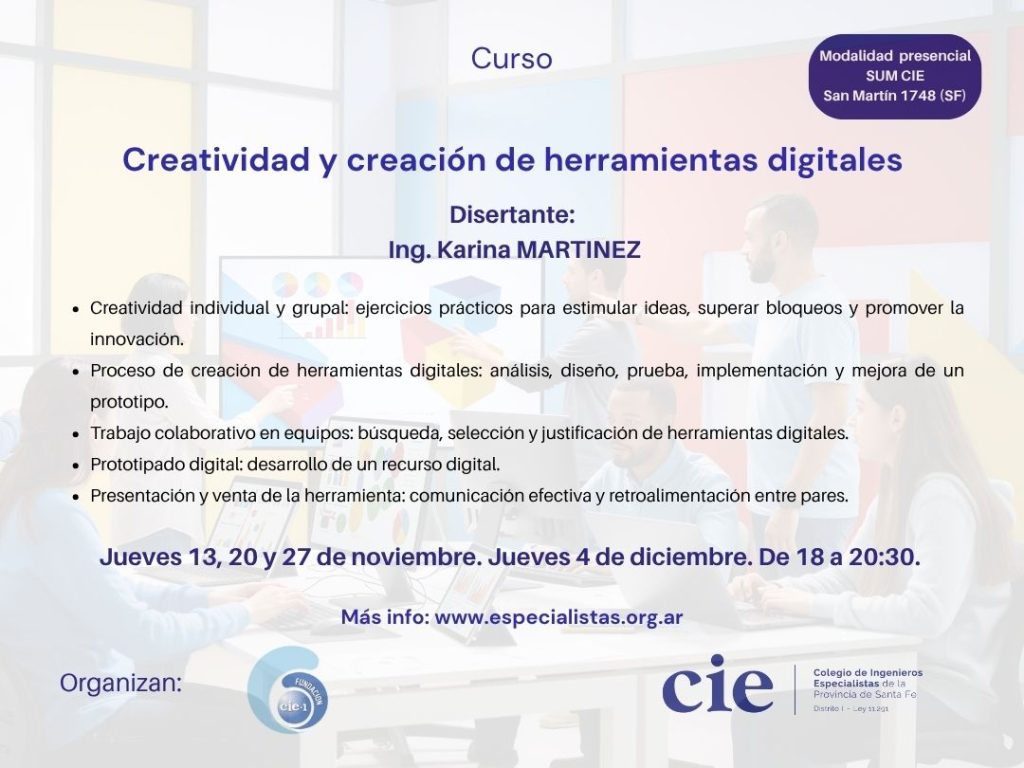 Jueves 13, 20 y 27 de noviembre. Jueves 4 de diciembre. De 18 a 20:30. Presencial en el SUM del CIE, San Martín 1748, Santa Fe.