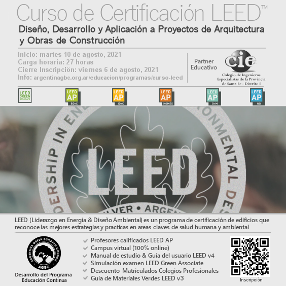 El Curso anual de Certificación LEED Diseño, Desarrollo Aplicación a Proyectos de Arquitectura & Obras de Construcción se desarrollará del 10 de agosto al 19 de octubre.