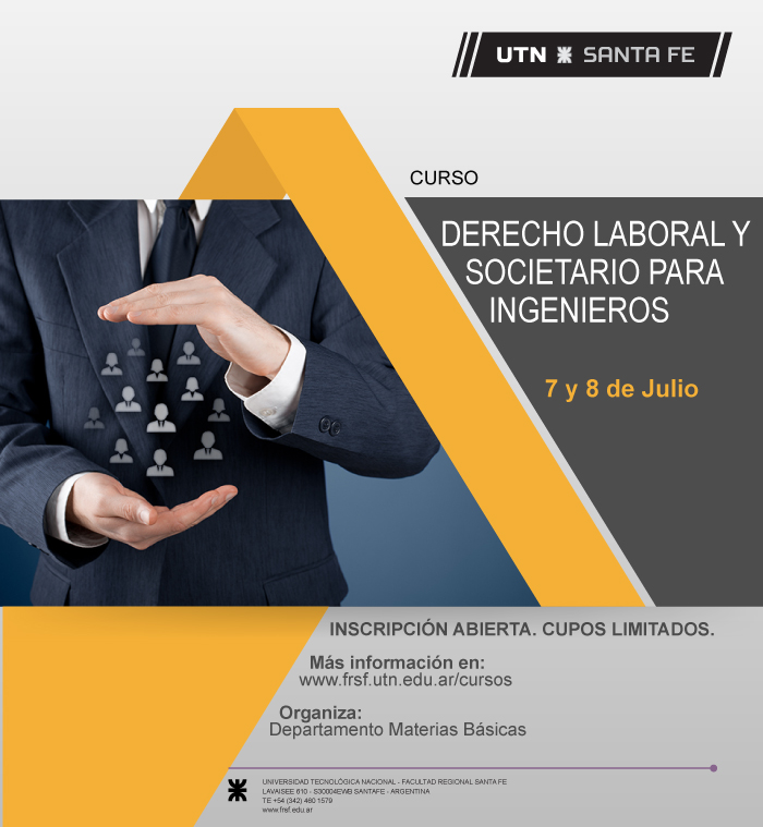 Se encuentra abierta la inscripción al curso “Derecho laboral y societario para ingenieros”, que se dictará en la UTN Santa Fe, los días 7 y 8 de julio. Está organizado por el Departamento de Materias Básicas y el dictado del mismo será en el Aula Multimedios 5.