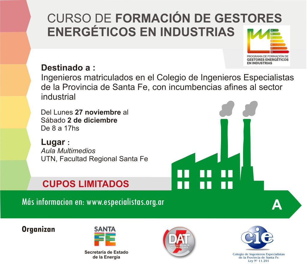 Este Curso de Formación de Gestores Energéticos en Industrias se realizará desde el lunes 27 de noviembre al sábado 2 de diciembre en el aula Multimedios 5 la UTN FRSF y está dirigido a matriculados en el CIE.