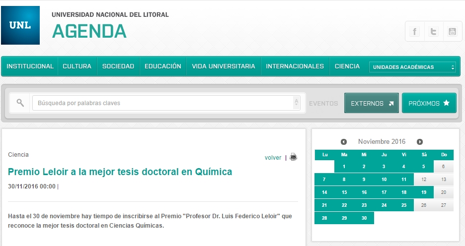 La Facultad de Ciencias Exactas y Naturales (FCEyN) de la Universidad de Buenos Aires (UBA) llama a inscripción al Premio “Profesor Doctor Luis Federico Leloir” que reconoce la mejor Tesis Doctoral en Ciencias Químicas. De acuerdo a las bases aprobadas, pueden aspirar al premio todos los doctores en Ciencias Químicas que hayan aprobado su Tesis Doctoral en alguna Universidad Nacional entre el 1º de octubre del 2014 y el 1º de octubre del 2016.