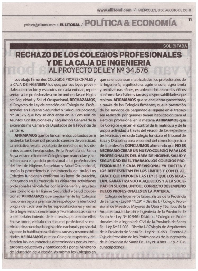 “…No es necesario crear un nuevo Colegio para los Profesionales del Área de Higiene, Salud y Seguridad en el Trabajo, los Colegios Profesionales y Caja Previsional ya existen y los representan en los límites y con el alcance que imponen las leyes que los regulan….”