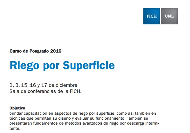 El objetivo del curso es brindar capacitación en aspectos de riego por superficie, como así también en técnicas que permitan su diseño y evaluar su funcionamiento. También se presentarán fundamentos de métodos avanzados de riego por descarga intermitente.
