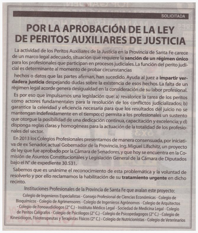 Las instituciones Profesionales de la Provincia de Santa Fe que avalan el proyecto “Regulación de la actividad de los Peritos Especialistas de la Provincia de Santa Fe” publicaron una solicitada en diario El Litoral el pasado 9 de noviembre del corriente.