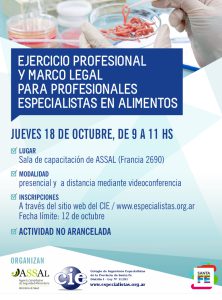 Disertantes: Autoridades del CIE y de la ASSAL. Día y lugar Jueves 18 de octubre de 9 a 11. Sede de ASSAL – Francia 2690 – Santa Fe. Modalidad PRESENCIAL para residentes en la ciudad de Santa Fe. VIDEOCONFERENCIA para residentes en otras localidades. Destinatarios Ingenieros Químicos, Ingenieros en Alimentos, Ingenieros en Tecnología de los Alimentos, Licenciados en Ciencias […]