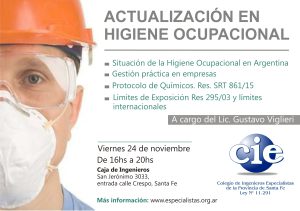 Lugar y fecha Salón de la Caja de Ingeniería. Viernes 24 de noviembre de 16 a 20. Disertante Lic. Gustavo Viglieri, vicepresidente de la Asociación de Higienistas de la República Argentina (AHRA). Temas a desarrollar: Estado de situación de la Higiene Ocupacional en Argentina Gestión practica de la Higiene Ocupacional en la empresa SRT 861/15 . Protocolo de […]